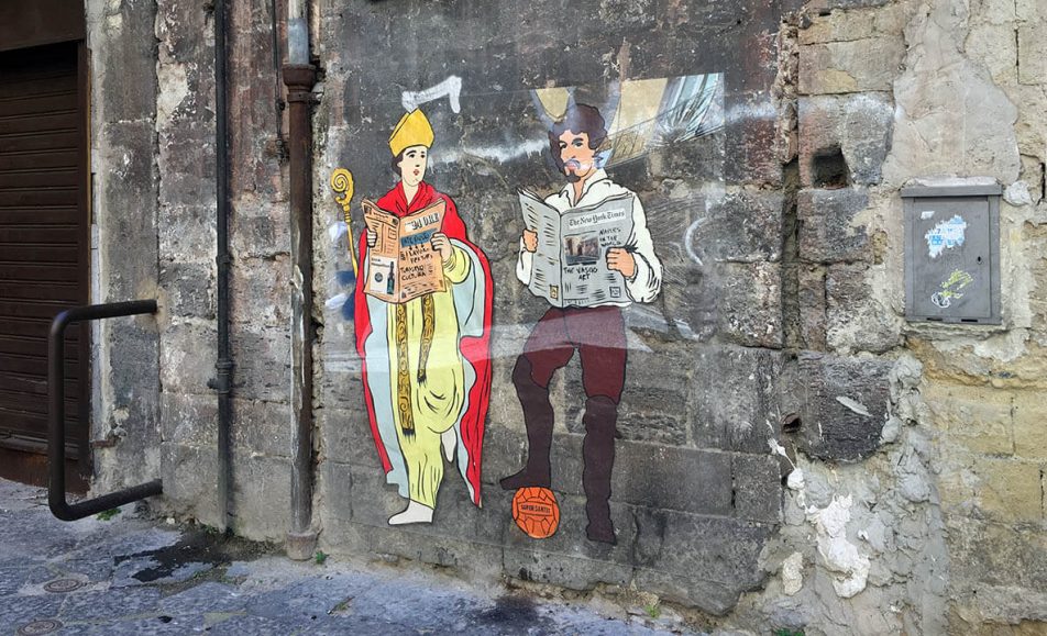 Il murales realizzato da Roxy in the Box in Piazza Cardinale Sisto Riario Sforza Caravaggio è intento a leggere il New York Times, un piede appoggiato su un Super Santos; San Gennaro, invece, sfoglia Il Sole 24 Ore dove in...