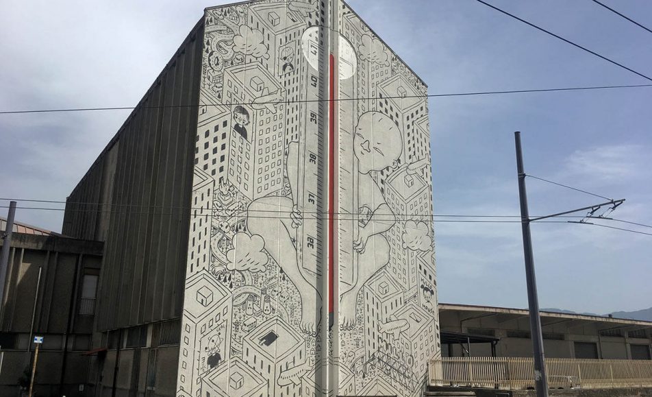 L’opera si trova sulla Palazzina dei Ferrovieri della Stazione delle Ferrovie dello Stato Il tratto in bianco e nero, un bambino, di dimensioni fuori scala che interagisce con la città che lo circonda, tra strade ad anello e grattacieli, un...