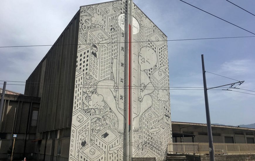 L’opera si trova sulla Palazzina dei Ferrovieri della Stazione delle Ferrovie dello Stato Il tratto in bianco e nero, un bambino, di dimensioni fuori scala che interagisce con la città che lo circonda, tra strade ad anello e grattacieli, un...