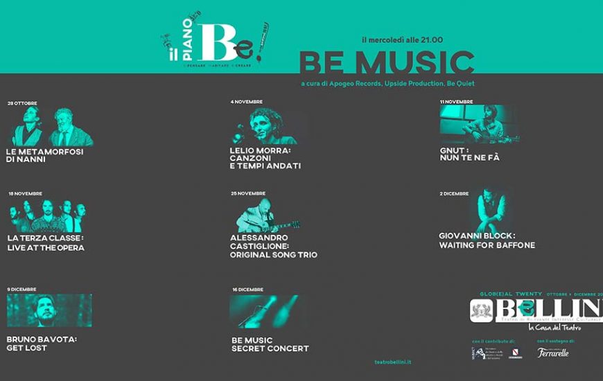 Il mercoledì musicale dal 28 ottobre al 16 dicembre 2020 Si rinnova il sodalizio tra Apogeo Records, Upside Production ed il collettivo BeQuiet per un’altra intensa stagione al Teatro Bellini di Napoli con i nomi più interessanti della scena musicale...
