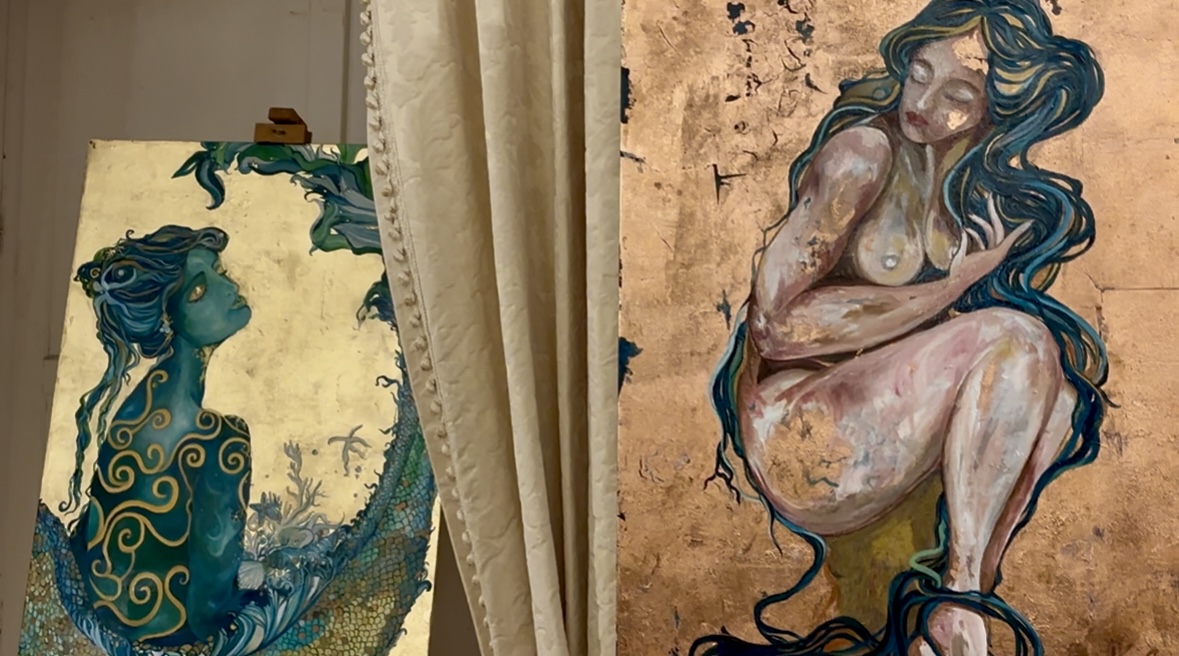 La mostra, che si estende sui due piani del Real Casino Borbonico, ruota attorno al mito di Partenope, figura simbolo della storia di Napoli. Un mito che, tra cinema e letteratura — come nel recente Partenope (2024) di Paolo Sorrentino — non smette di essere attuale, trovando oggi una nuova forma d’espressione attraverso la pittura di Bevilacqua. A guidarci nell’immaginario della mostra è stato il dialogo con la sua creatrice, Cinzia Bevilacqua, classe 1964. Alle spalle una formazione da autodidatta, dettata dalla passione per la pittura ed il disegno.
