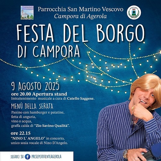 La Festa del Borgo di Campora è un evento organizzato con il patrocinio del Comune di Agerola e con il sostegno dell’iniziativa “Insieme per la Parrocchia”, ed è pensato per unire generazioni e valorizzare le tradizioni del territorio.