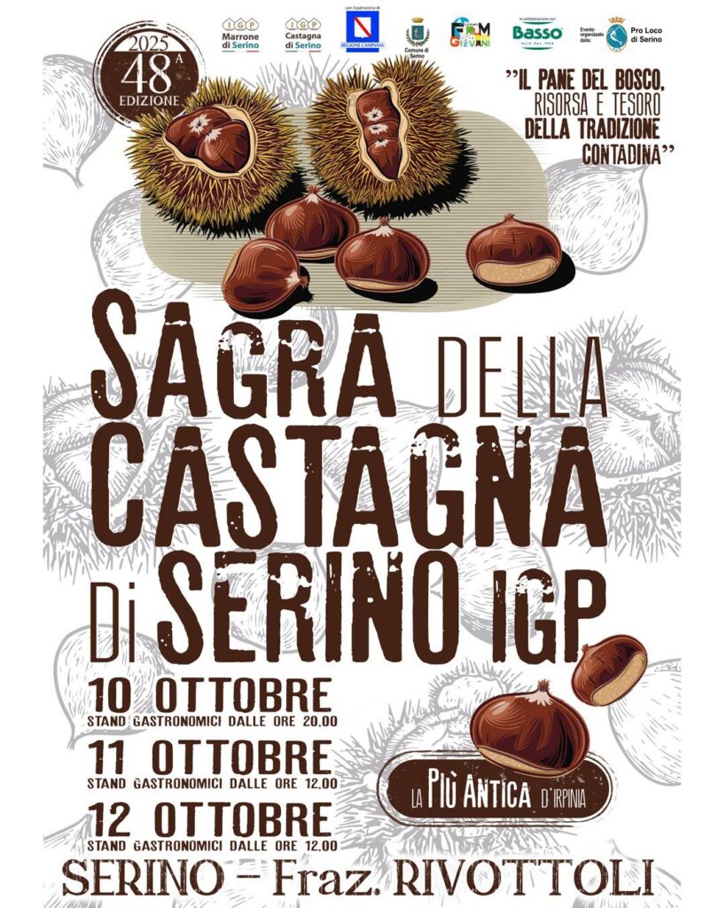 Ufficializzate le date della 48esima edizione della “Sagra della Castagna di Serino”. La manifestazione si terrà da venerdì 10 a domenica 12 ottobre 2025 presso la frazione Rivottoli di Serino, in provincia di Avellino.