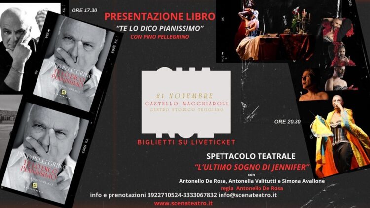 L’inizio dello spettacolo è previsto alle ore 20.30. A fare da preview di pomeriggio, alle ore 17.30 la presentazione del libro di Pino Pellegrino, casting director italiano cinematografico e televisivo, Primo Nastro d’argento della categoria casting director (2014) che presenterà presenterà il suo recente libro “Te Lo Dico Pianissimo”. Si apre così la rassegna ScenaTeatroLibri, che porterà a Teggiano autori straordinario del mondo dello spettacolo, del teatro, dell’arte e della cultura.