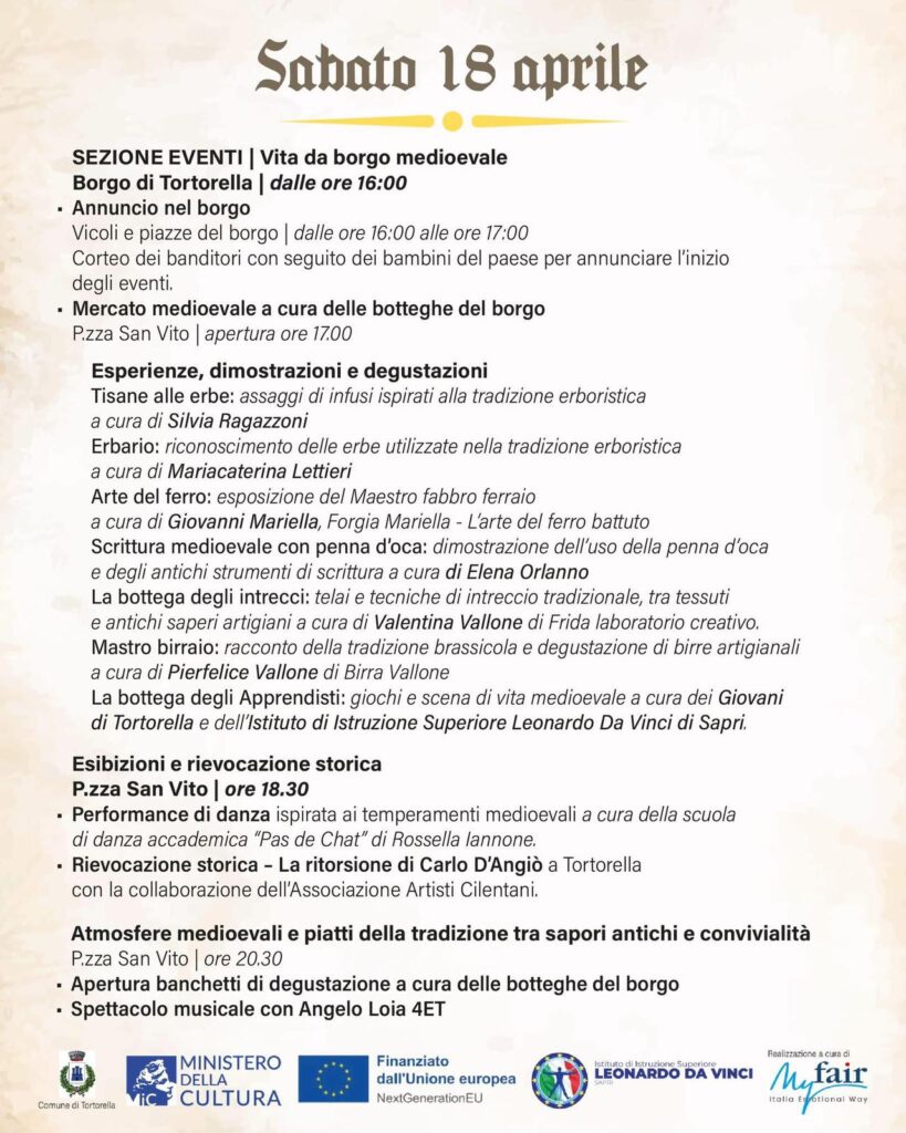 Il mercato medioevale sarà popolato da erboristi, fabbri, scribi, artigiani del legno e della tessitura insieme a dimostrazioni e laboratori aperti al pubblico. Nel pomeriggio e nella sera del sabato, Tortorella si trasforma in un teatro a cielo aperto con rievocazioni storiche, performance artistiche, danze di suggestione medioevali. I visitatori potranno vivere anche un percorso esperienziale tra degustazioni, botteghe e atmosfere d’epoca in un dialogo continuo tra cultura, intrattenimento e tradizione gastronomica.