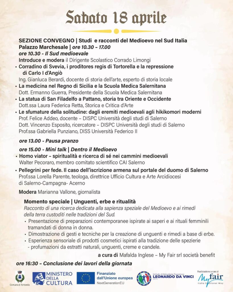 La prima parte del sabato sarà dedicata al confronto scientifico con un convegno che riunisce studiosi e accademici da diverse università italiane, ma anche interventi divulgativi, per esplorare il Medioevo come chiave di lettura del presente: dalla storia del Mezzogiorno alla medicina medievale, dalla spiritualità dei cammini alla rilettura contemporanea dei fenomeni sociali.