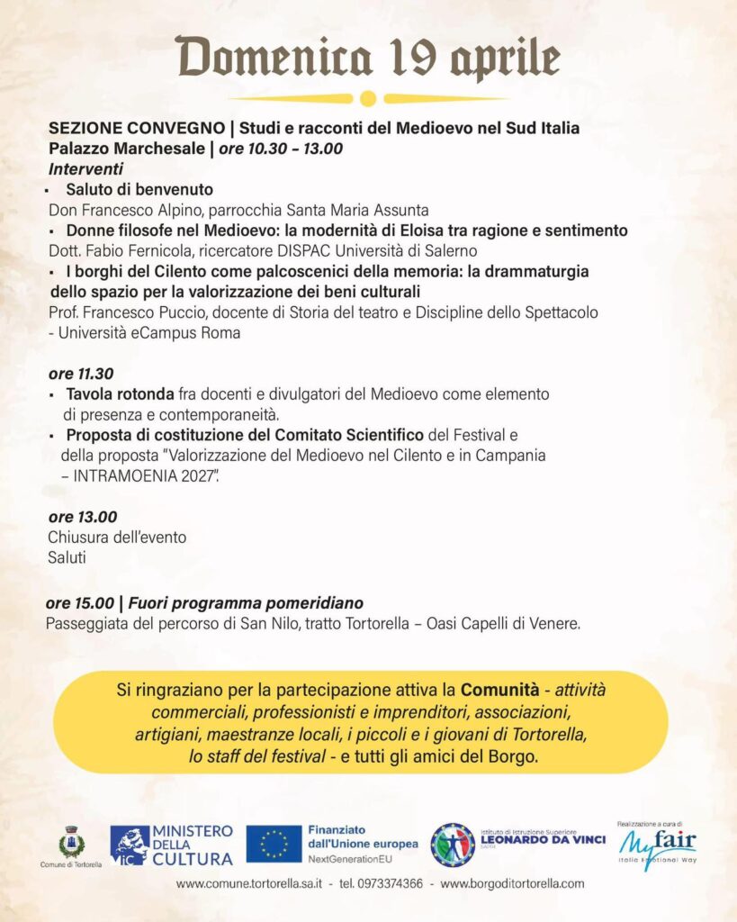 “Il Festival Medioevale è il risultato di un lavoro lungo e complesso che ha coinvolto amministrazione, tecnici, associazioni e cittadini. Una sfida – spiega il sindaco di Tortorella, Nicola Tancredi – per dimostrare che anche una piccola comunità può ambire a progettualità culturali di grande respiro capaci di attrarre visitatori, valorizzare il territorio e generare nuove opportunità. È un percorso di crescita che nasce dalla collaborazione e dalla volontà di investire sulla nostra identità.”