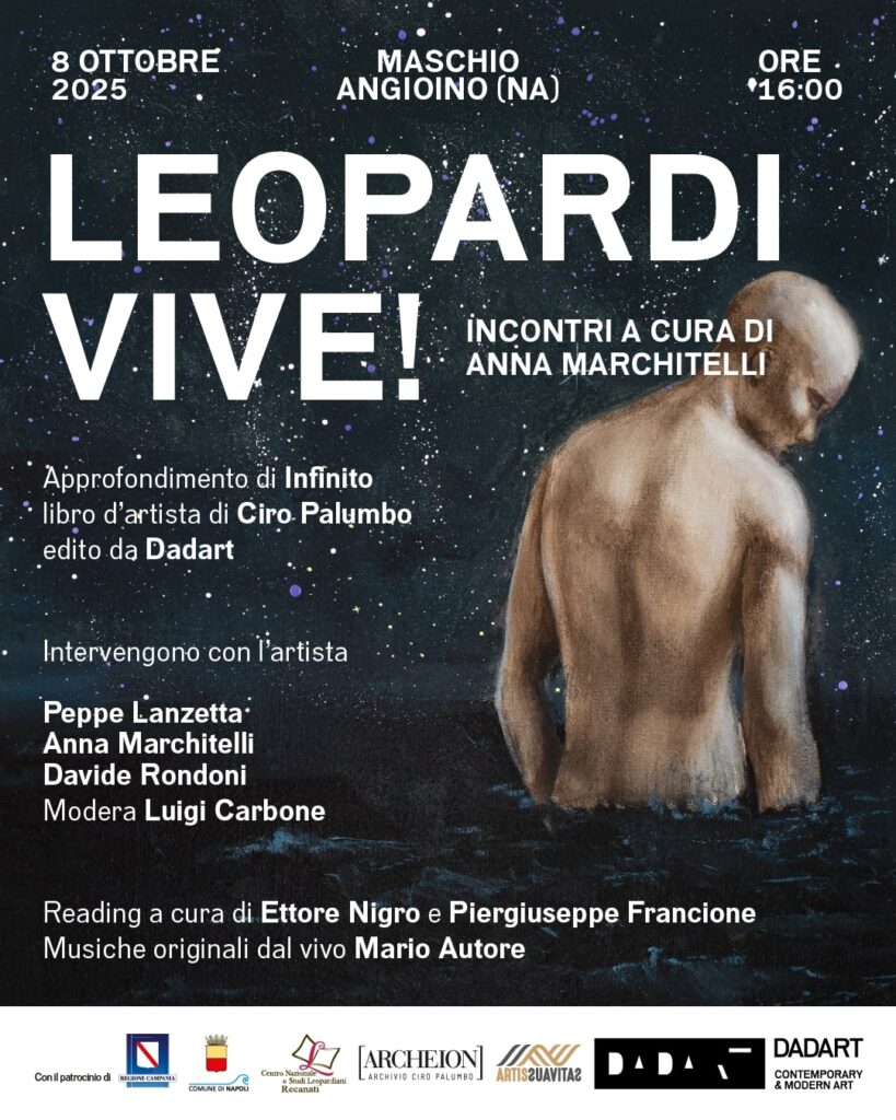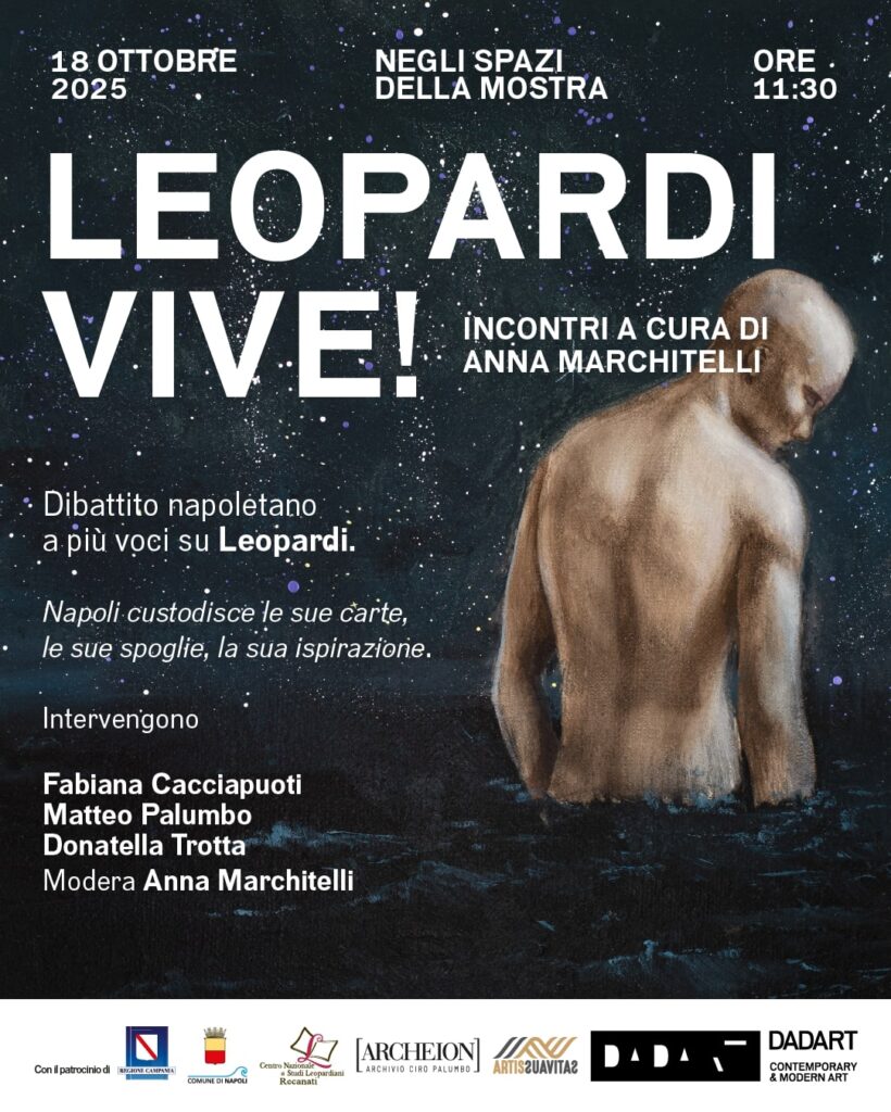 Sabato 18 ottobre 2025, alle ore 11, all’interno degli spazi dove è esposta la mostra, si terrà Leopardi, una storia di vita e poesia che ancora ci parla (e ci salva), un incontro di approfondimento su Giacomo Leopardi, la città di Napoli e L’Infinito, riflettendo sull’attualità di una storia poetica e di vita che ancora ispira artisti e studiosi. D’altra parte la città partenopea custodisce le sue carte, la sua ispirazione, le sue spoglie.