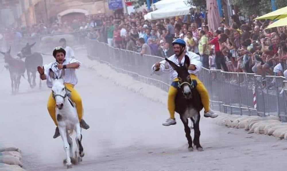 La competizione del Palio si tiene al culmine di una sfilata in costume. Lungo il Corso Garibaldi il corteo in costumi d’epoca medievale attraversa il borgo medievale cinto da due ali di folla, introducendo la corsa degli asini, montati da cavalieri che devono giungere al traguardo portando integro sotto un braccio l’anguria destinata alla regina.