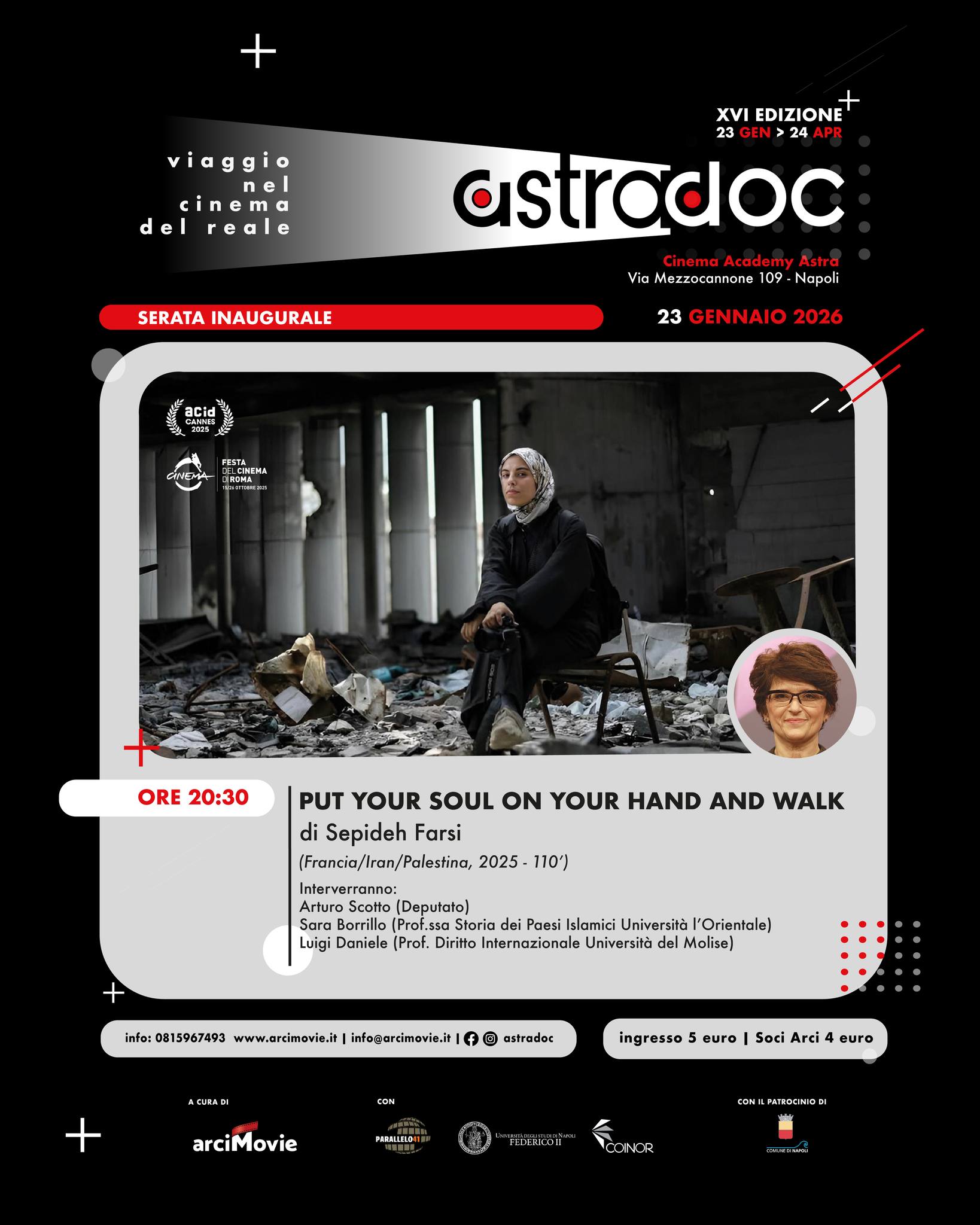 Ad inaugurare la kermesse sarà “Put Your Soul on Your Hand and Walk” di Sepideh Farsi, con Fatma Hassona, presentato in prima mondiale a Cannes 2025 e successivamente alla Festa del Cinema di Roma. La serata, in programma venerdì 23 gennaio alle 20:30, sarà introdotta dal curatore Antonio Borrelli e accompagnata dagli interventi del deputato Arturo Scotto, della professoressa Sara Borrillo (Storia dei Paesi islamici, Università L’Orientale) e del professor Luigi Daniele (Diritto internazionale, Università del Molise).