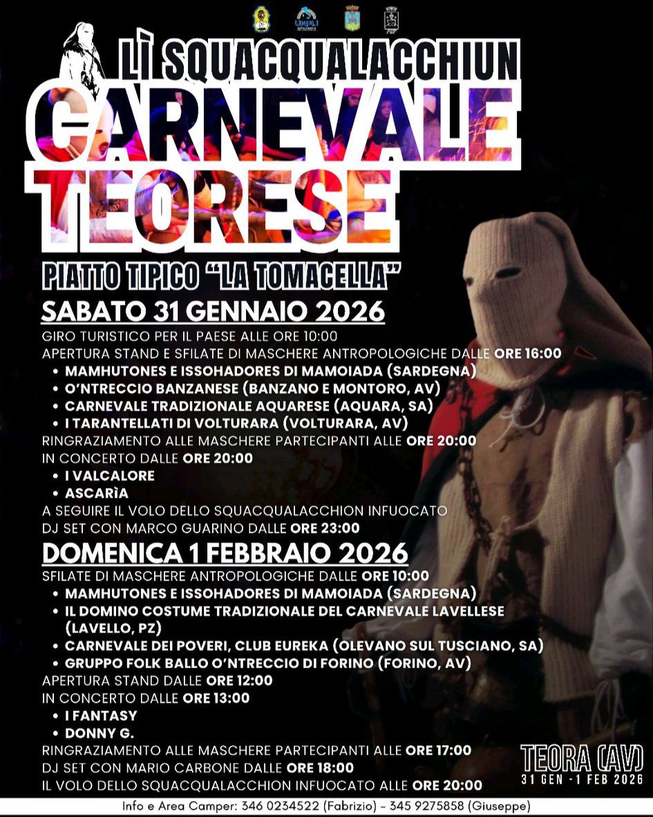 Un’esperienza unica tra tradizione, folklore e divertimento è quella che assicurano gli organizzatori del Carnevale Teorese. Le vie di Teora, in provincia di Avellino, torneranno a risuonare del caos gioioso degli Squacqualacchiun, le maschere più irriverenti e suggestive del Carnevale campano. L’appuntamento organizzato dalla Pro Loco di Teora e dall’Amministrazione Comunale è per sabato 31 gennaio e domenica 1 febbraio 2026. Due giorni di riti, suoni, tamburi, catene e colori che risvegliano l’anima del paese. E non solo: saranno presenti anche altri gruppi e maschere antropologiche provenienti da diverse tradizioni, per un viaggio unico nel folklore più autentico. Immancabile il piatto tipico: La Tomacella!