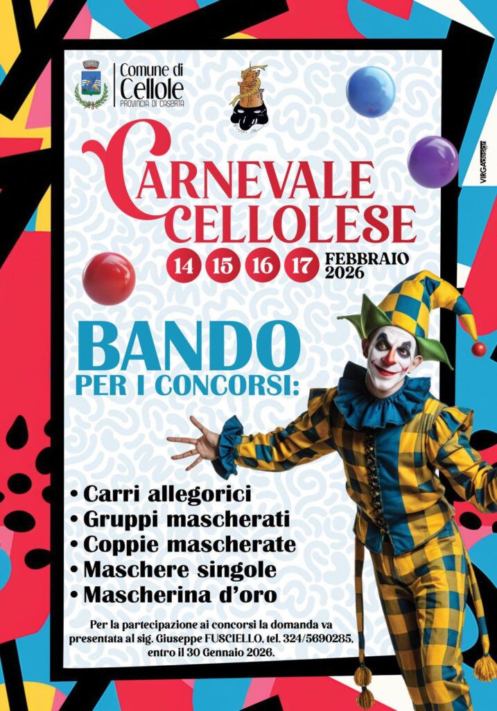 Ritorna anche quest’anno, con tutto il suo carico di allegria, il Carnevale Cellolese. La cittadina di Cellole, in provincia di Caserta, sarà teatro di una serie di sfilate di maschere e carri allegorici in programma dal 14 al 17 febbraio 2026. Ecco il programma dettagliato: