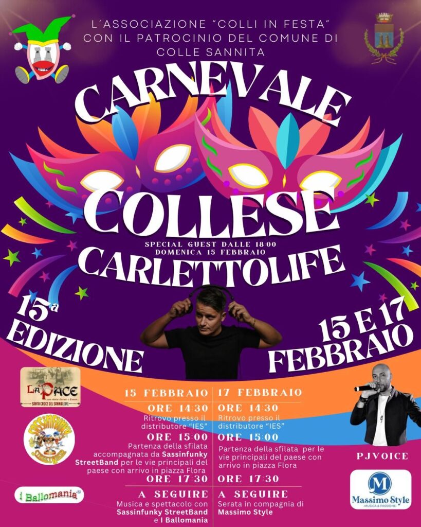 Edizione numero 15 per il Carnevale Collese in programma domenica 15 e martedì grasso 17 febbraio 2026 a Colle Sannita, in provincia di Benevento. L’evento è organizzato dall’Associazione ‘Colli in Festa’ con il patrocinio del Comune. Come ogni anno, il momento più divertente sarà quello della sfilata dei carri allegorici e dei gruppi mascherati per le vie del paese, una cornice meravigliosa in cui Colle Sannita si pone come punto di ritrovo e di esaltazione nel lancio di stelle filanti e coriandoli. Ecco il programma dettagliato: