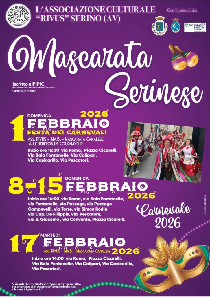Ufficializzate le date delle esibizioni della Mascarata Serinese che animerà il Carnevale 2026 a Serino, in provincia di Avellino, organizzato come sempre dall’Associazione Culturale “Rivus”. Un appuntamento consolidato che torna a rallegrare il borgo irpino. Ecco le date: 1, 8, 15 e 17 febbraio 2026, inizio alle ore 14.00.