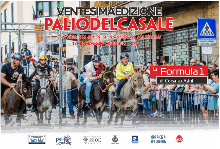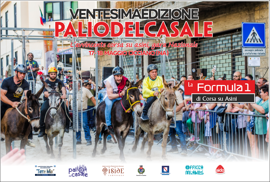 Il 17 e 18 maggio 2025 Cicciano, in provincia di Napoli, accoglierà la ventesima edizione del Palio del Casale, la storica gara nazionale di corsa su asini, che vedrà protagonisti i fantini rappresentanti delle 19 regioni italiane.