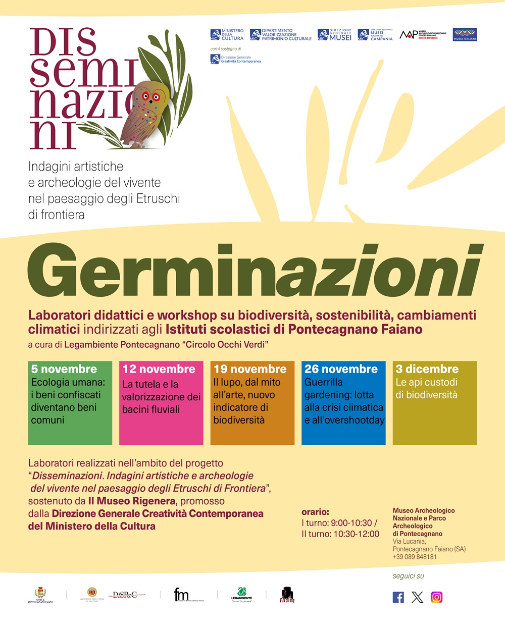 Il programma di laboratori e workshop, indirizzati agli studenti degli Istituti scolastici di Pontecagnano Faiano, a cura di Legambiente Pontecagnano “Circolo Occhi Verdi”, è incentrato sui temi della tutela dell’ambiente, della sostenibilità e transizione ecologica, della lotta ai cambiamenti climatici, della salvaguardia della biodiversità, e si propone di sensibilizzare le giovani generazioni sulle tematiche di rigenerazione urbana e sociale su base culturale del progetto “Il Museo rigenera”.
