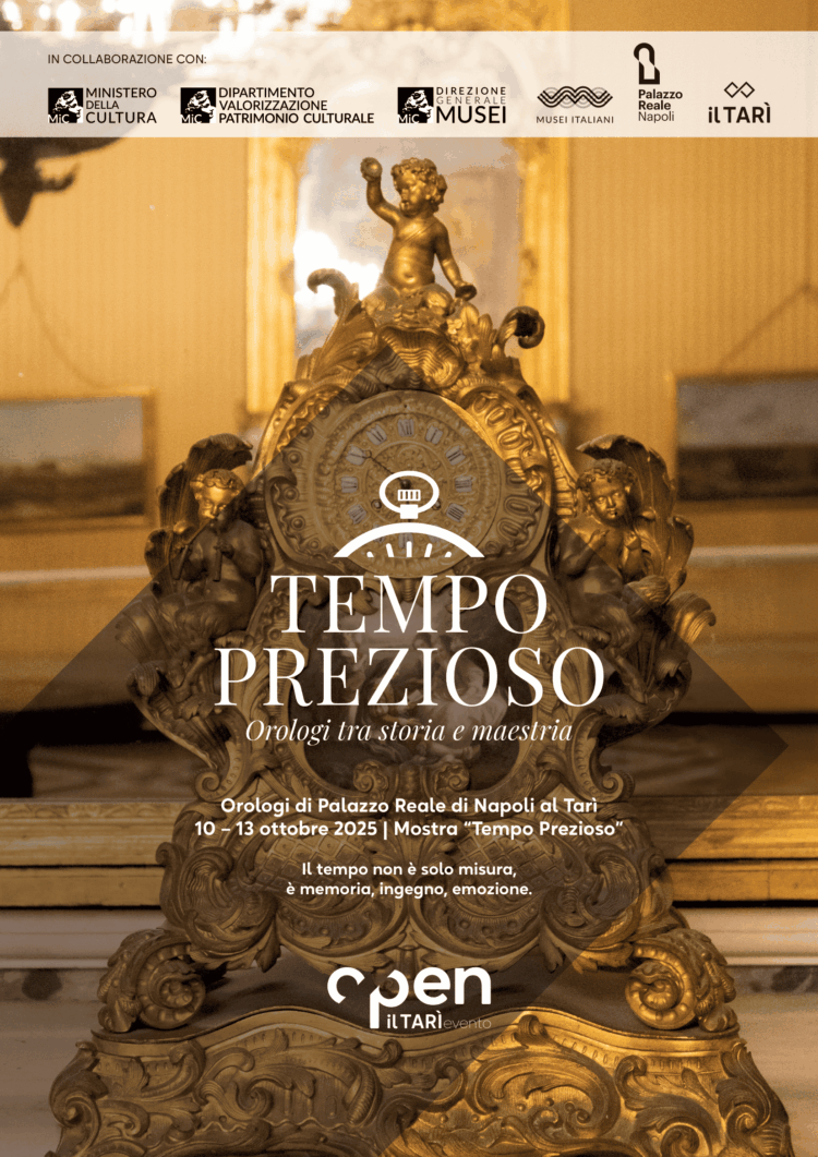 Alcuni orologi del Palazzo Reale di Napoli, saranno esposti in una mostra dal titolo Il Tempo Prezioso al Centro Orafo il Tarì in occasione dell’evento Open dal 10 al 13 ottobre 2025 a Marcianise (Caserta).