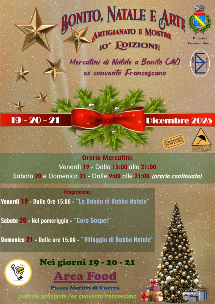 Decima edizione per i mercatini di Natale a Bonito. Ad ospitare la manifestazione sarà l’ex convento francescano. Appuntamento dal 19 al 21 dicembre 2025. Ecco il programma della manifestazione: