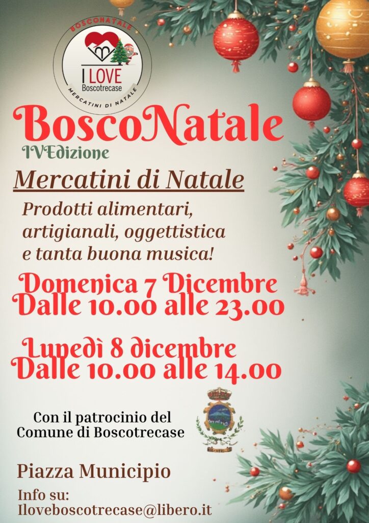 Tornano i Mercatini di Natale in Piazza Municipio a Boscotrecase. La IV edizione della manifestazione si terrà domenica 7 e lunedì 8 dicembre 2025. Ecco il programma: