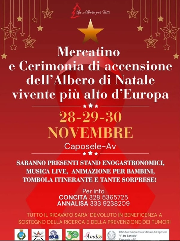 Tutto pronto a Caposele, in provincia di Avellino, per uno degli eventi più attesi dell’anno. Dal 28 al 30 novembre 2025 si terrà infatti il Mercatino di Natale e la Cerimonia di accensione delle luminarie sull’albero di Natale più alto d’Europa! Tre giorni di solidarietà, enogastronomia, musica, emozioni e tanta magia.