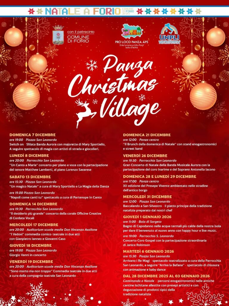 Ecco il programma ufficiale degli eventi natalizi di Panza, realizzato in collaborazione e con il prezioso supporto dell’amministrazione comunale di Forio. Un calendario ricco di musica, tradizioni, spettacoli, presepi, degustazioni e momenti dedicati a grandi e piccini… per vivere la magia del Natale.