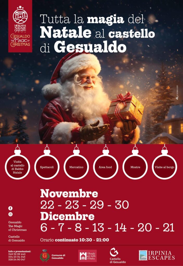 Tutta la magia del Natale al Castello di Gesualdo. Il borgo irpino si trasforma in un luogo incantato dove grandi e piccini potranno vivere un’esperienza unica tra luci, profumi e sorrisi. Dal 22 novembre al 21 dicembre 2025, ogni sabato e domenica, il Castello di Gesualdo apre le sue porte per accogliervi nel cuore della magia natalizia!
