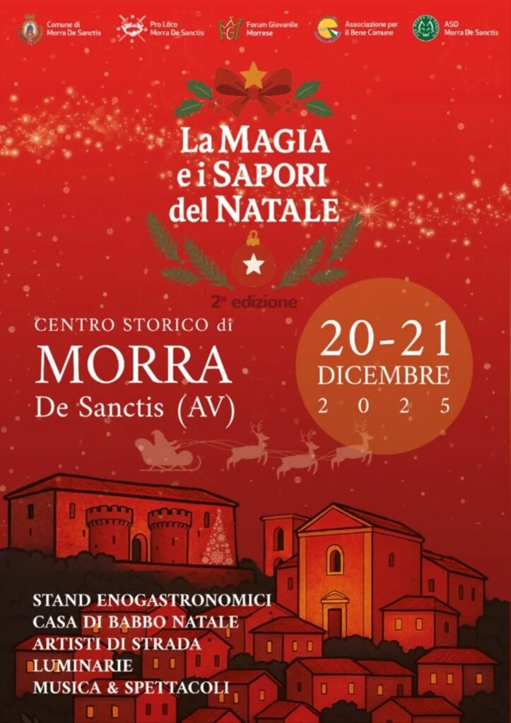 Seconda edizione per la manifestazione ‘La Magia e i Sapori del Natale’ a Morra de Sanctis, in provincia di Avellino. Due giorni in programma il 20 e 21 dicembre 2025 nel centro storico del borgo irpino tra stand enogastronomici, la casa di Babbo Natale, artisti di strada, luminarie, musica e spettacoli.