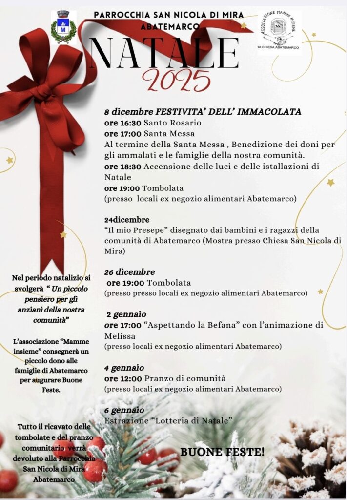 Ufficializzato il programma di eventi natalizi che caratterizzerà la frazione di Abatemarco di Montano Antilia, in provincia di Salerno. Il cartellone di eventi nasce dalla sinergia tra la Parrocchia San Nicola di Mira e l’Associazione Mamme Insieme.
