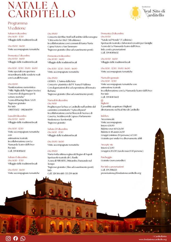 Un cartellone particolarmente ricco per grandi e piccini: dal Villaggio delle Tradizioni locali agli stand dedicati all’arte presepiale; dalla tappa della manifestazione motoristica Napoli Racing Show del patron Enzo Rivellini, con la sfilata di auto storiche e moderne, al ritorno dei Cavalli Persano, grazie alla partnership con il Centro di incremento ippico della Regione Campania; dalle visite accompagnate all’apertura straordinaria delle Scuderie reali; dall’artigianato natalizio alle degustazioni dei prodotti tipici. E non solo.