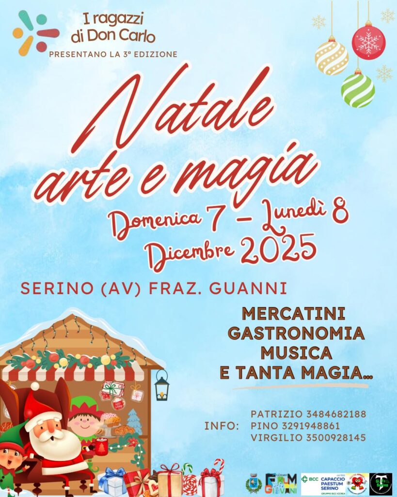 Il 7 e l’8 dicembre a Serino il Natale si accende davvero: luci che ti prendono per mano, mercatini vivi, profumi che scaldano, bambini che scrivono sogni e Babbo Natale che ascolta tutti. Appuntamento nella Frazione di Guanni con i Ragazzi di Don Carlo.