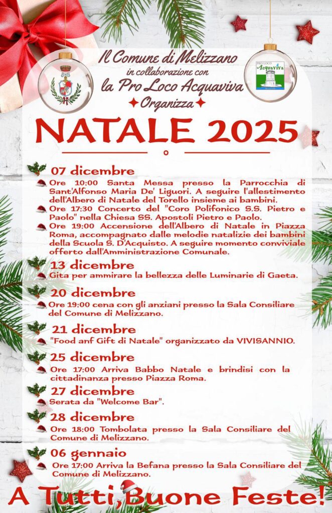 Un mese di eventi e appuntamenti, dal 7 dicembre 2025 al 6 gennaio 2026, il Comune di Melizzano, insieme alla Pro Loco Acquaviva, vi invita a vivere la magia del Natale con un ricco calendario di eventi: concerto, accensione dell’albero, gita, tombolata e momenti speciali per grandi e piccini. Ecco il programma dettagliato: