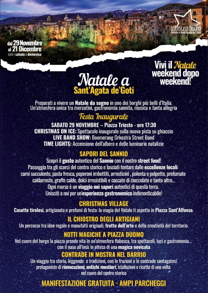 La magia del Natale rivive per la sua seconda edizione a Sant’Agata dei Goti, uno dei Borghi più belli d’Italia. Appuntamento tutti i sabato e domenica dal 29 novembre al 21 dicembre 2025. (clicca qui per tutte le informazioni)