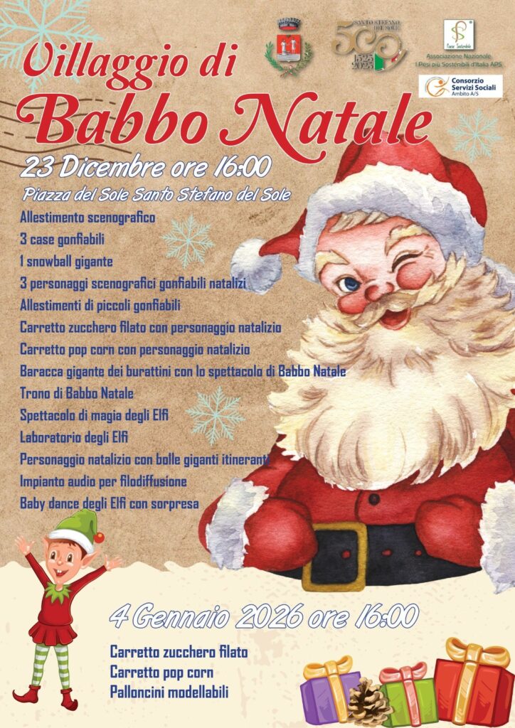 Doppio appuntamento a Santo Stefano del Sole con il Villaggio di Babbo Natale: il 23 dicembre 2025 e il 4 gennaio 2026 a partire dalle ore 16.00.