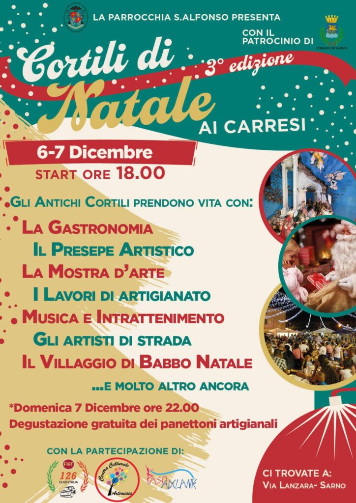Tornano i Cortili di Natale ai Carresi, in via Lanzara a Sarno. La terza edizione della manifestazione natalizia è in programma sabato 6 e domenica 7 dicembre 2025 a partire dalle ore 18.00. Gli antichi cortili del borgo si riaccendono di magia e tradizione: un viaggio tra sapori, arte, musica e atmosfere natalizie che scaldano il cuore.
