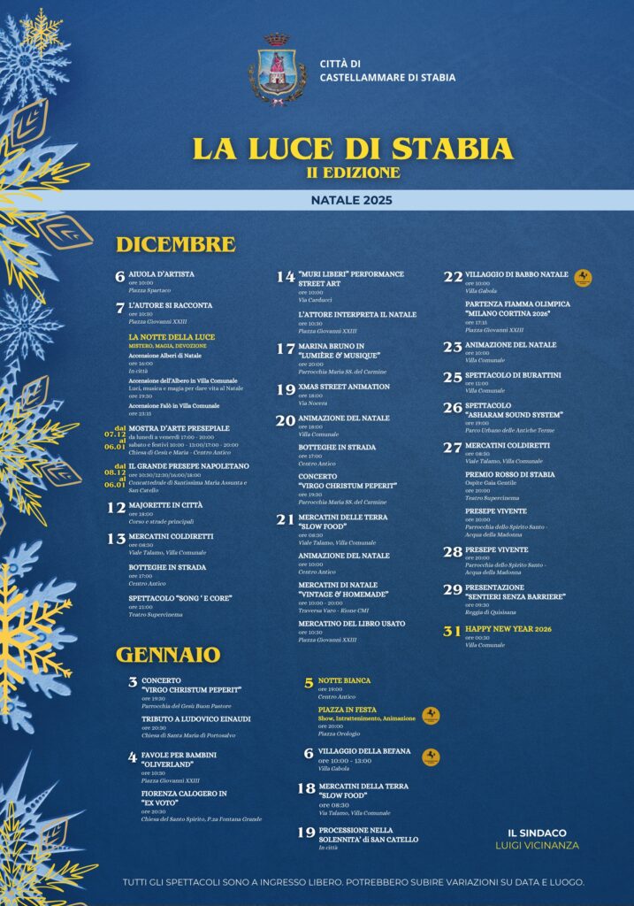 “Sarà la luce a guidarci anche quest’anno: una luce che unisce, scalda e illumina il nuovo cartellone di eventi natalizi pensato per Castellammare di Stabia e per tutti coloro che vivranno con noi la magia delle festività. Tra luci, spettacoli, musica e divertimento, ospiteremo in città circa quaranta eventi organizzati e finanziati dall’Amministrazione Comunale, in parte anche grazie al sostegno della Città Metropolitana di Napoli e della Camera di Commercio, che animeranno tutto il periodo delle feste dal 6 dicembre 2025 al 19 gennaio 2026, giorno dedicato al patrono San Catello. Un calendario che si arricchisce inoltre di tanti altri appuntamenti promossi dalle associazioni cittadine, testimonianza della vitalità culturale e turistica della nostra Castellammare di Stabia” – è quanto dichiara il sindaco Luigi Vicinanza presentando la seconda edizione de “La Luce di Stabia”, il cartellone di eventi natalizi.