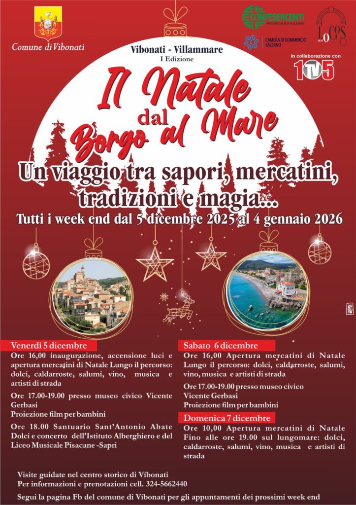 Prima edizione per la manifestazione ‘Il Natale dal Borgo al Mare’ in programma a Vibonati, in provincia di Salerno. Un viaggio tra sapori, mercatini, tradizioni e magia che accompagnerà tutto il periodo natalizio. Questo il programma del primo week end dal 5 al 7 dicembre 2025.