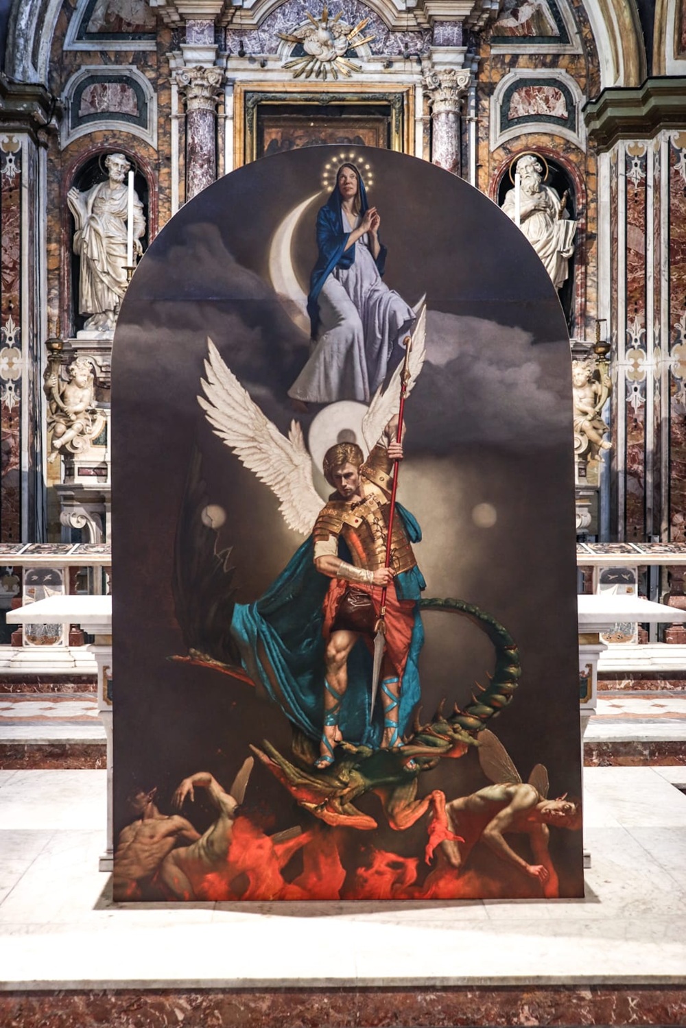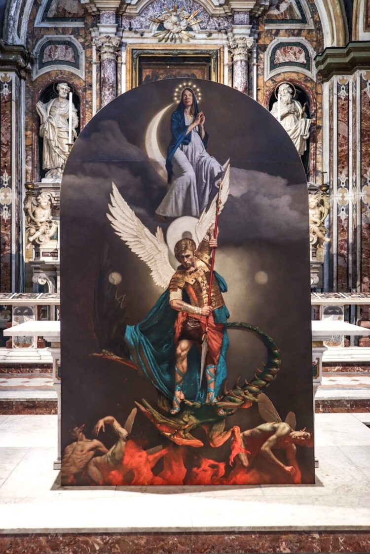 Il ventre gonfio, pieno di Spirito, allude alla nuova alba futura in cui la grazia riempirà l’intera terra. Nella bella tela si staglia maestosa la figura dell’Arcangelo, principe delle milizie celesti, armato come un soldato romano dallo svolazzante mantello turchino, che richiama le tipiche cromie di Luca Giordano, presente con le sue molteplici opere nelle chiese napoletane. Con un movimento dalla leggerezza celestiale che sembra quasi contrastare con la possenza delle sue tornite e muscolose carni, impugna la lancia che trafigge il Demonio, una bestia deforme a metà tra un alieno ed un ibrido uomo-animale.