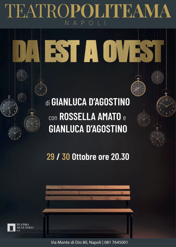Mercoledì 29 e giovedì 30 ottobre 2025 alle ore 20.30, al Politeama di Napoli, in Via Monte di Dio 80, sarà in scena “Da Est a Ovest” di Gianluca D’Agostino, con Rossella Amato e Gianluca D’Agostino, che firma anche la regia. Scene di Carmela Rosamilia. Musiche originali Bluenne, Maurilio Riccio, Antonio Vitelli. Disegno luci e coord. rep. tecnico Rossella Coppola. Assistente regia e fonica Rebecca Carlizzi.