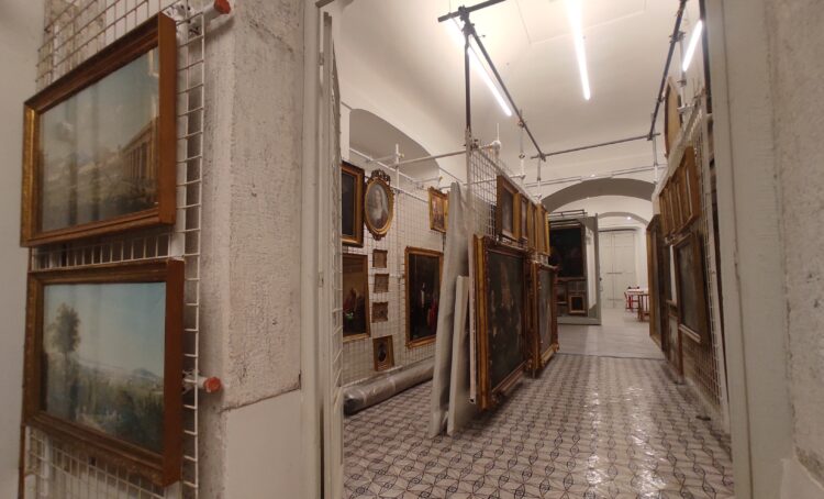 Non solo Giuseppe Bonito ma anche il pittore Salvatore Fergola con sue splendide vedute di Napoli e dei Campi Flegrei. È depositata qui anche una rarissima veduta di Palermo nell’orto di Boccadifalco con tanto di sovrani in relax sotto ad un piccolo pergolato. Fergola, allievo di Hackert, fu un paesaggista al servizio di S.M. Francesco I di Borbone ed è considerato un “reporter d’eccezione” della Napoli nella prima metà dell’Ottocento. Ma, tra le opere di Fergola, Bonito, Carracci, delicate Madonne cinquecentesche, ritratti dei sovrani Savoia in splendide cornici lignee con stemma sabaudo, spunta, in questi depositi, anche un rarissimo quadro di Eugenio Viti.Viti fu un grande pittore degli inizi del ‘900 la cui tecnica si distingue per i forti tocchi coloristici che fanno pensare al movimento dei Fauves. L’opera nei depositi fu acquistata dai Savoia e rappresenta una figura nuda immersa in uno spazio verde “macchiato” da foglie, vasi e frutti. Al di sotto si scorgono invece i due ritratti di Re Ferdinando di Borbone e Maria Carolina d’Austria: sguardo vispo lui, ceruleo lei. Sembrano custodi eterni di questi luoghi “segreti” dove, tra l’acre odore dei solventi, si respira la nostra straordinaria storia!