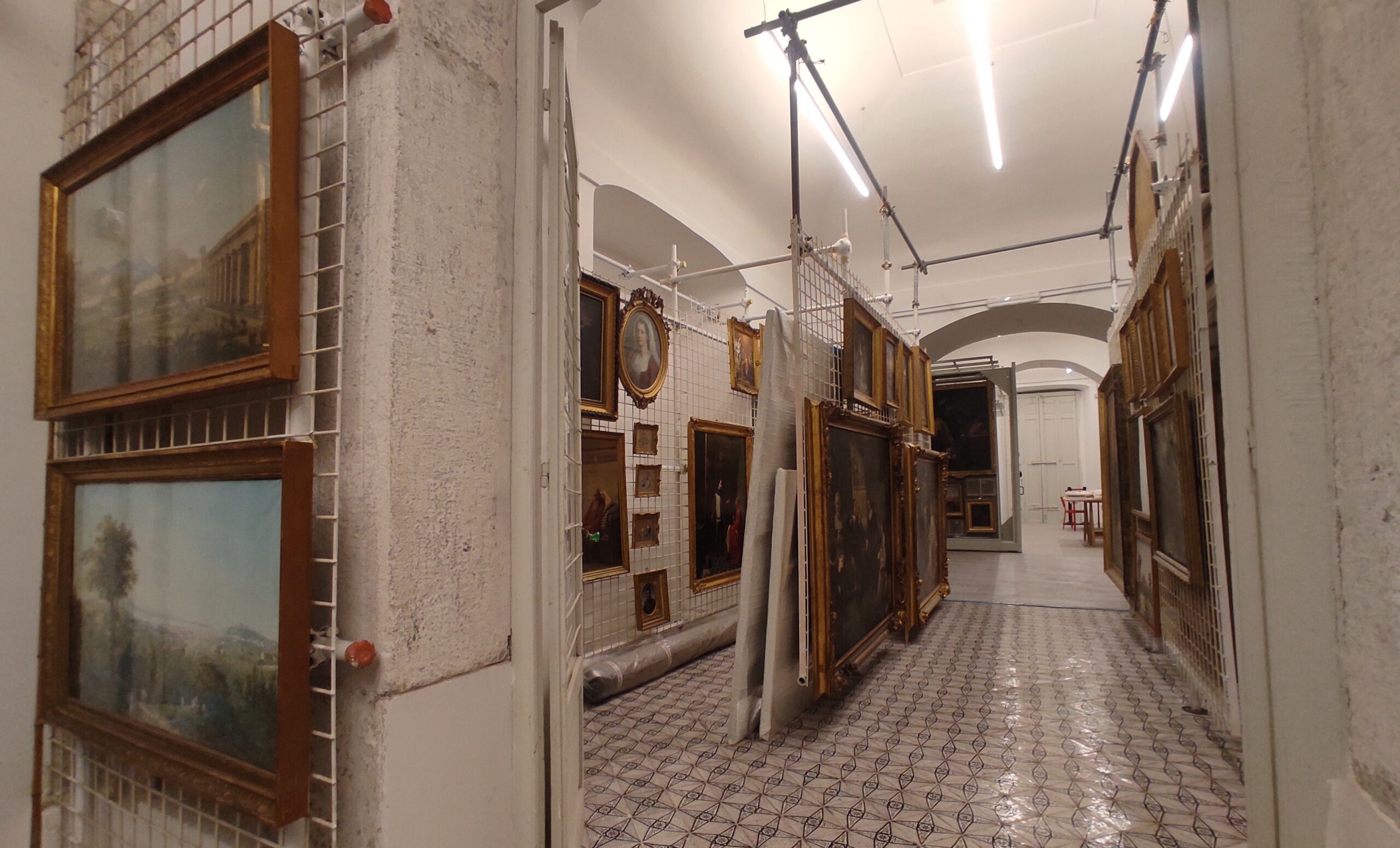 Questo luogo è un “dietro le quinte” affascinante che, attraverso oggetti e strumenti di restauro e pulitura, ci rimanda alla storia del palazzo che fu vicereale, francese, borbonico e dei Savoia. La mano di tutti si distingue ovunque soprattutto dove, tra utilissime “griglie scorrevoli”, ci sono centinaia di quadri in attesa di interventi di restauro tra rulli in polistirolo, tavola calda, solventi, tecniche di cerottatura e tamponatura. In una di queste sale con pareti in laterizio e antiche fornaci, è in bella mostra un “Don Chisciotte contro i mulini a vento” di Giuseppe Bonito, realizzato, tra le altre tele già collocate nelle sale del Palazzo Reale, come cartone preparatorio per una importante serie di arazzi della Real Fabbrica di Napoli.