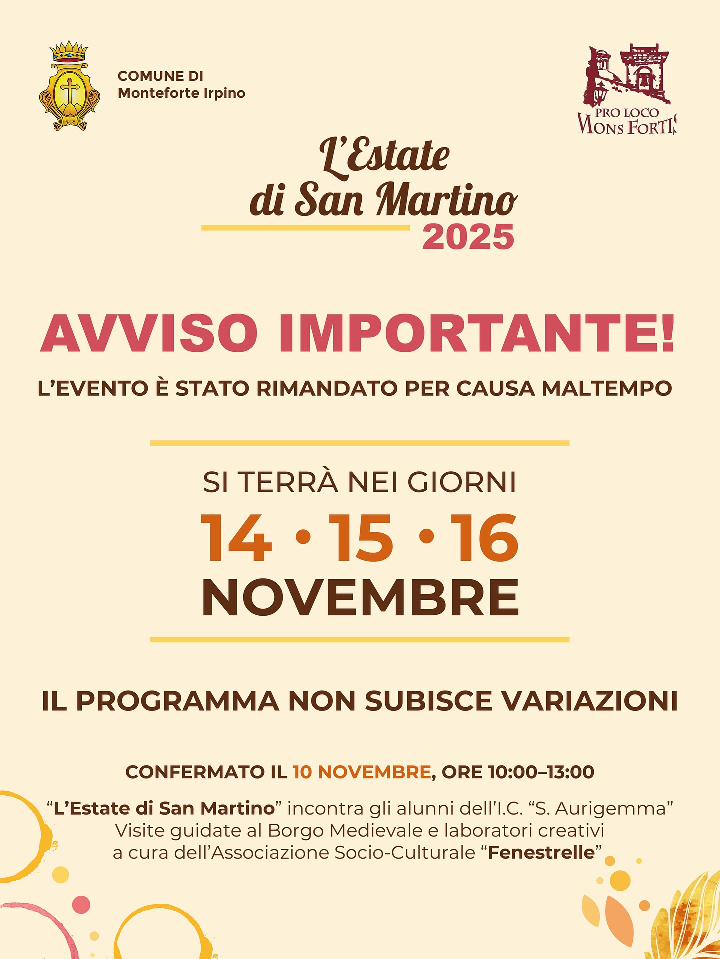 Tre giorni dedicati ai sapori, alle tradizioni e al folklore dell’Irpinia. Torna a Monteforte Irpino l’appuntamento con ‘L’Estate di San Martino’ in programma dal 14 al 16 novembre 2025 (l’evento inizialmente previsto dal 7 al 10 novembre è stato rinviato a causa delle condizioni meteo, resta solo confermato l’appuntamento del 10 novembre). Un viaggio tra stand gastronomici, prodotti tipici, musica e cultura nel cuore del borgo di San Martino. (clicca qui per tutte le informazioni)