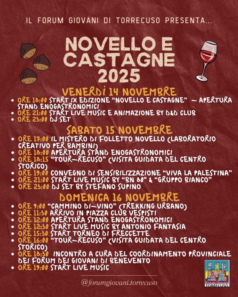 Nona edizione per la manifestazione ‘Novello e Castagne’ organizzato dal Forum dei Giovani di Torrecuso. Tre giorni di musica, cultura, trekking, divertimento e sapori unici dal 14 al 16 novembre 2025.