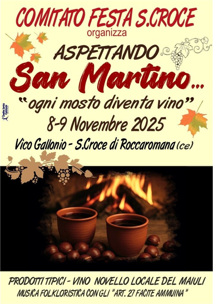 L’autunno a Santa Croce di Roccaromana profuma di mosto, caldarroste e tradizione! L’8 e il 9 novembre 2025 appuntamento in Vico Gallonio per vivere due serate all’insegna della convivialità, dei sapori autentici e della musica popolare. Vino novello locale del Maiuli, prodotti tipici del territorio, musica folkloristica con gli “Art. 27 Facite Ammuina”. Un appuntamento organizzato con passione dal Comitato Festa S. Croce