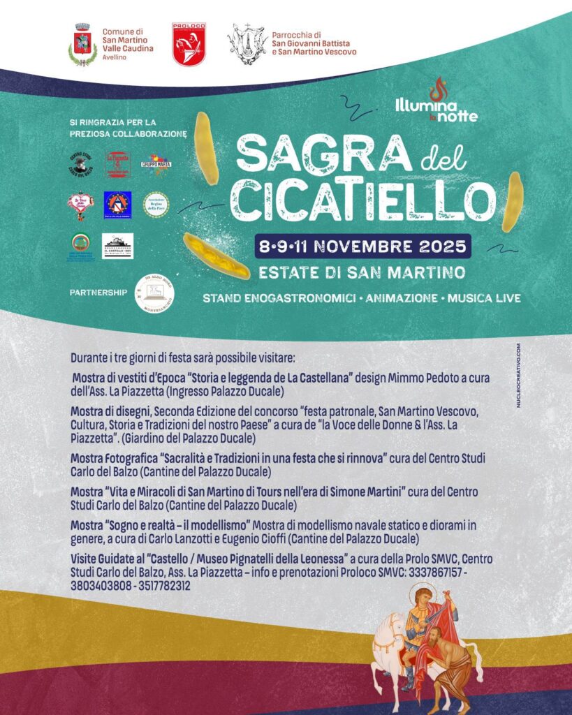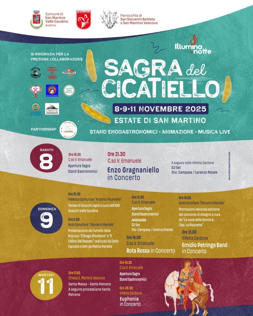 Appuntamento nei giorni 8, 9 e 11 novembre 2025 a San Martino Valle Caudina con la Sagra del Cicatiello. Tra sapori autentici, musica live e tanto divertimento. Ecco il programma dettagliato della manifestazione: