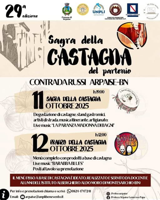 L’11 e il 12 ottobre, ad Arpaise, si svolge la 29esima edizione della “Sagra della Castagna del Piacentino”, appuntamento con la tradizione in un menù fisso a base di castagne servito da i docenti dell’Istituto Alberghiero “Aldo Moro” di Montesarchio e musica dal vivo. Ecco il programma: