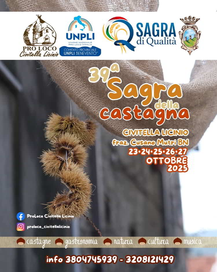 Edizione numero 23 per la Sagra della Castagna e del Pecorino Vitulanese organizzata dalla Pro Loco Camposauro e in programma dal 31 ottobre al 2 novembre 2025 a Vitulano. Tante novità vi aspettano per celebrare insieme i sapori e le tradizioni del territorio! A breve sarà ufficializzato il programma completo.