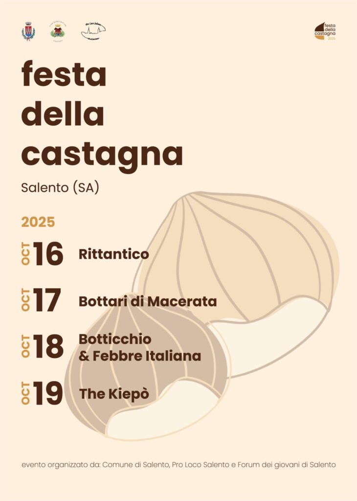 “La Festa della Castagna”, a Salento, non è solo buon cibo e tradizione, ma anche musica, sorrisi e tanta voglia di stare insieme. Un evento organizzato dal Comune di Salento, in collaborazione con la Pro loco e il Forum dei giovani di Salento, si svolgerà dal 16 al 19 ottobre presso la Piazza di Salento.