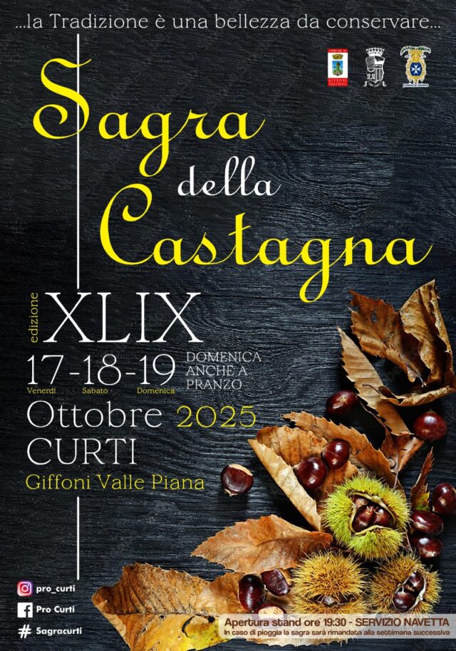 la Sagra della Castagna di Curti, giunta quest’anno alla sua 49ª edizione è un evento organizzato come sempre con passione e impegno dall’Associazione Pro Curti, e si terrà nei giorni 17, 18 e 19 ottobre, trasformando il suggestivo borgo di Curti in un palcoscenico di sapori, tradizioni e spettacoli dal vivo. Ecco la locandina: