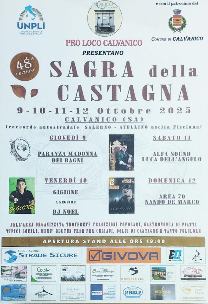 Il Comune di Calvanico ospita “La Sagra della Castgna”, dal 9 al 12 ottobre, con appuntamenti impedibili per riscoprire la tradizione gastronomica di piatti tipici popolari e musica tradizionale. Ecco il programma: