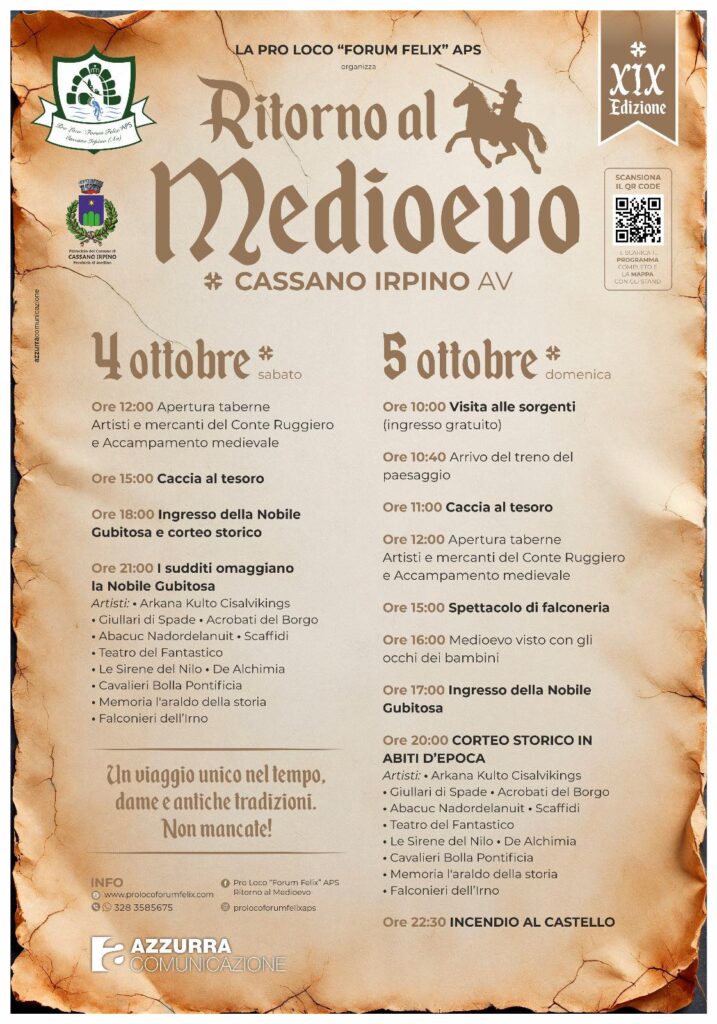 Due giornate immerse nella magia medievale tra storia, spettacoli e tradizioni a Cassano Irpino. Appuntamento sabato 4 e domenica 5 ottobre 2025 con l’evento organizzato dalla Pro Loco “Forum Felix” APS che animerà il borgo in provincia di Avellino.